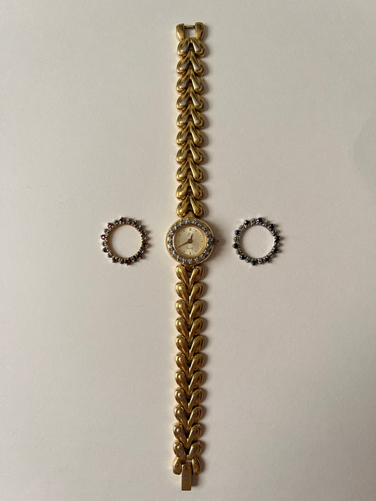 Beautiful Vintage Gold Tone Swiss Watch with Interchangeable Rubies and Sapphires Inset Bezels