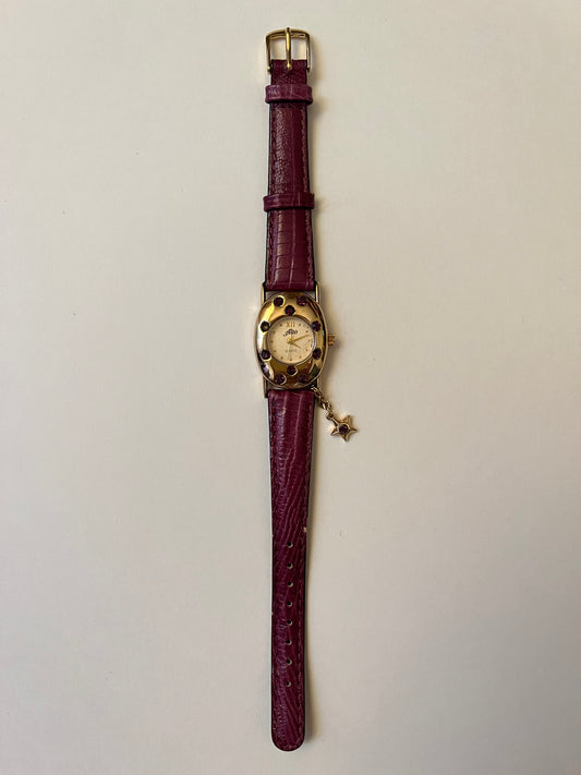 Extremely Rare and Breathtaking Gold Tone Watch with Ornate Band Design and Purple and Pink Stones Accent