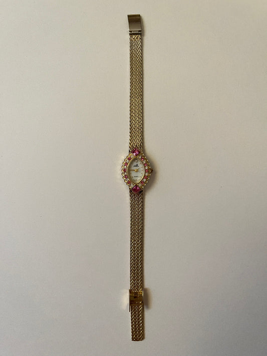 Gorgeous and Rare Gold Tone Watch with Almond-Shaped Dial and Pink and White Stones Accent