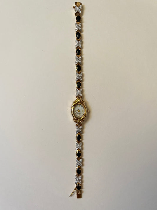 Lovely Vintage Gold Tone Watch with Decorative Oval Dial and Black Stones Accent