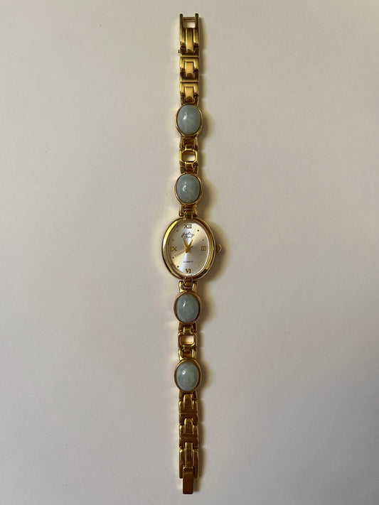Very Rare Gold Tone Watch with Oval Dial and Jade Stones Inlaid Band