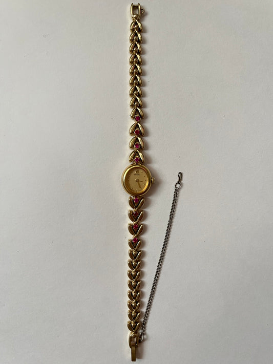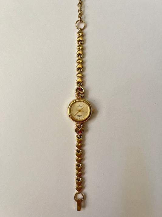 Adorable Dainty Gold Tone Swiss Watch with Heart-Shaped Links And Red Stones Accents