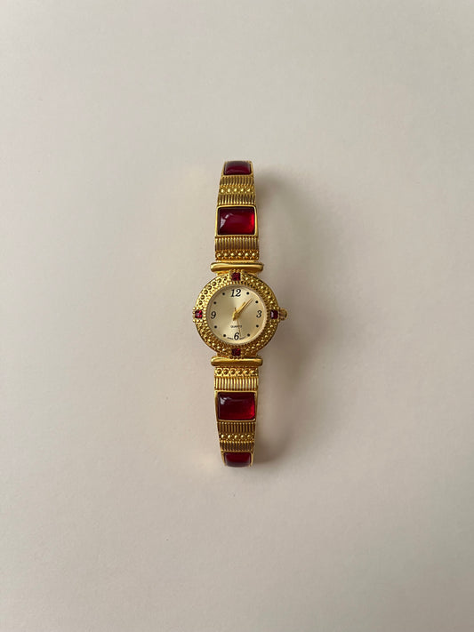 Gorgeous Gold Tone Expansion Watch with Red Gems Accent