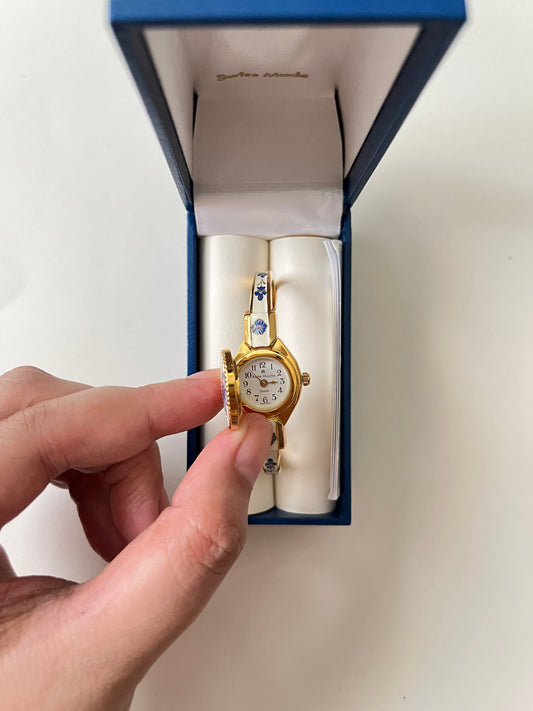 Beautiful Gold Tone Open Cuff Peekaboo Swiss Watch with Navy Floral Enameled Bracelet