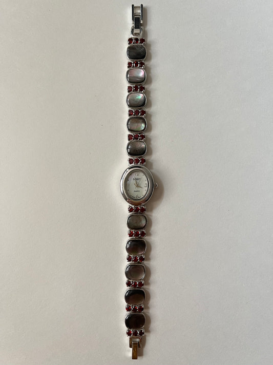 Captivating Silver Tone Watch with Red Stones and Gray Abalone Accents