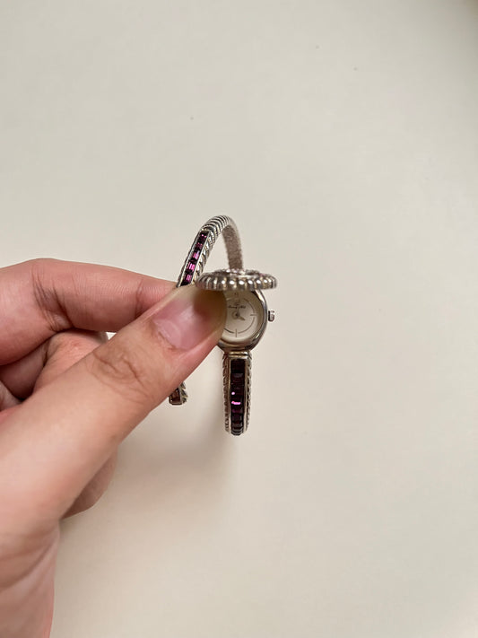 Very Unique Silver Tone Peekaboo Open Cuff Watch with Purple Stones Accent
