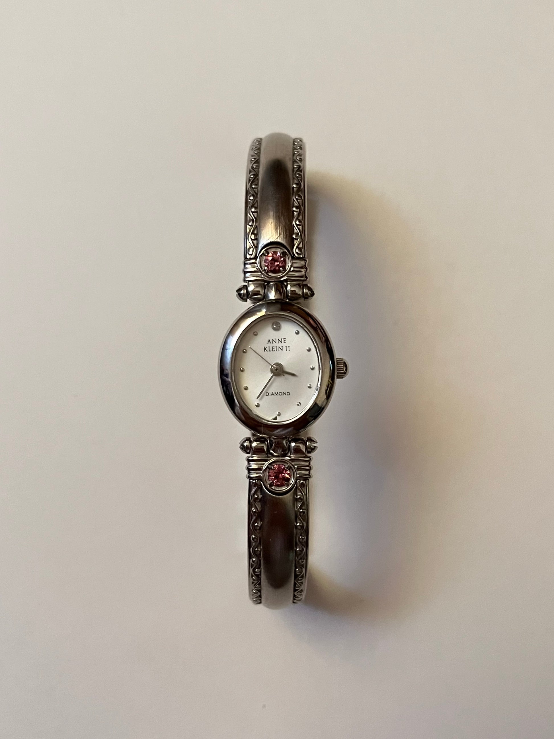 Silver Tone Anne Klein Cuff Watch with Oval Dial and Pink Stones Accent