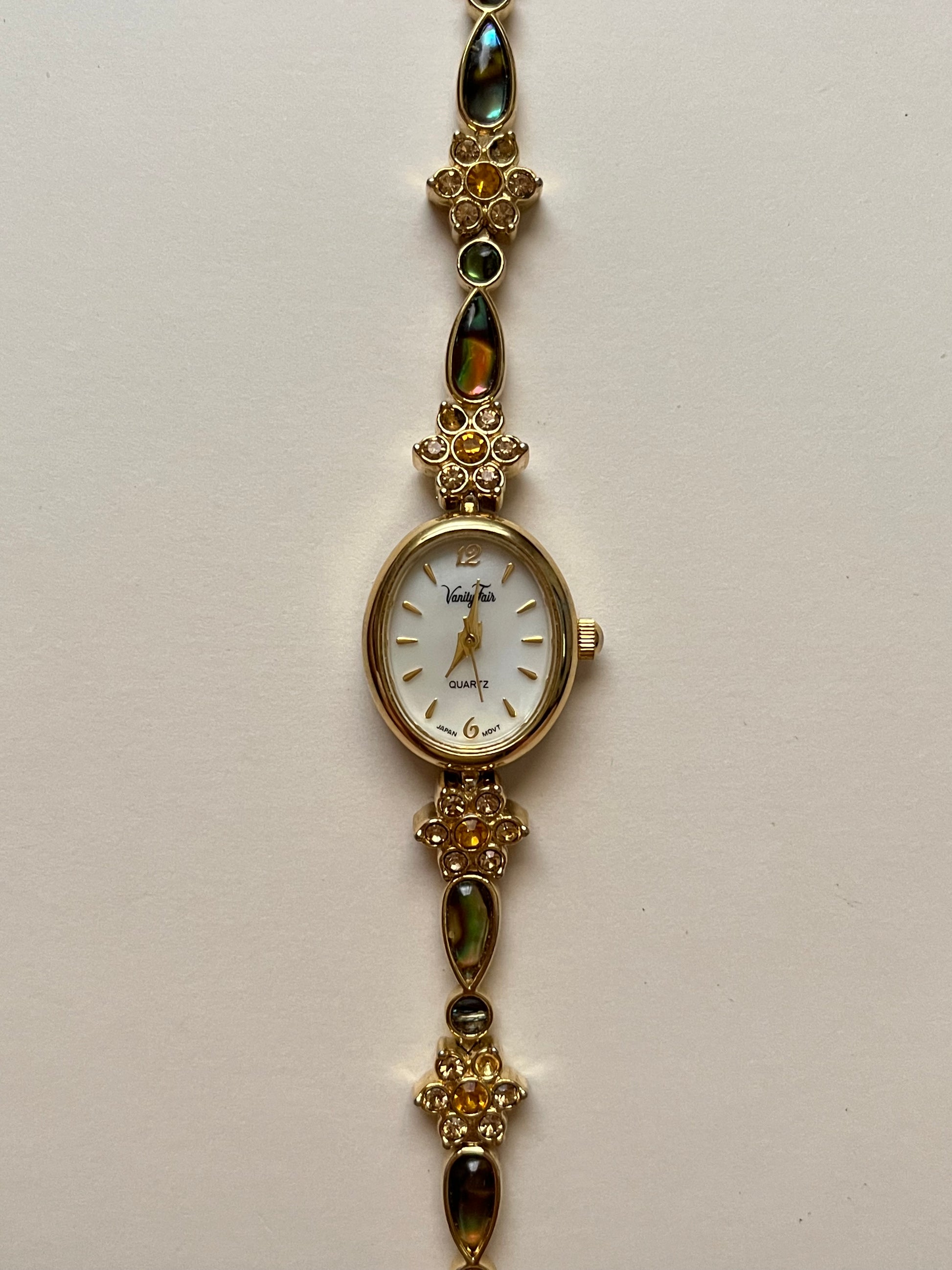 Beautiful and Dainty Gold Tone Watch with Abalone and Rhinestones Accents