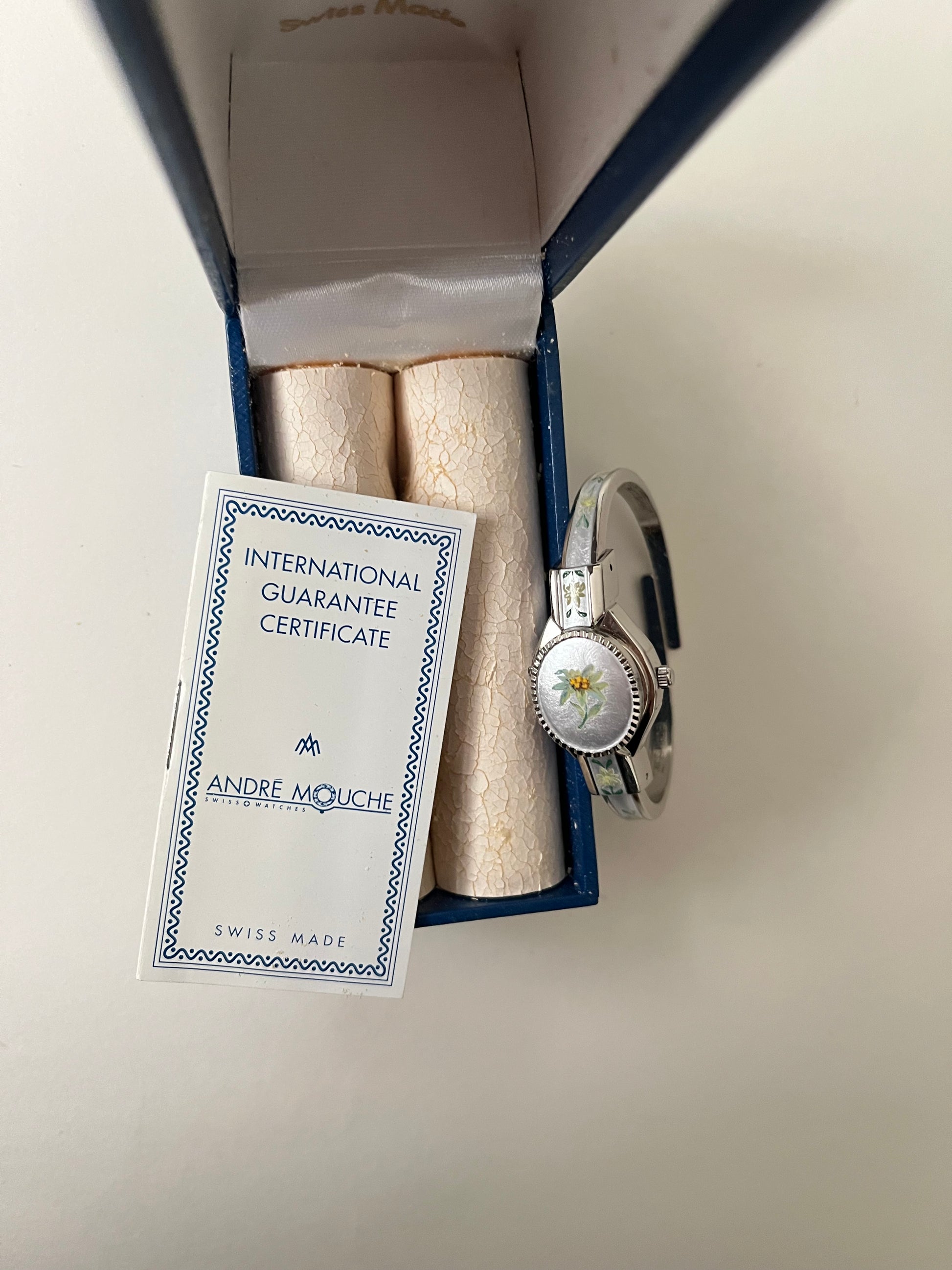 Beautiful Silver Tone Open Cuff Peekaboo Swiss Watch with White Floral Enameled Bracelet