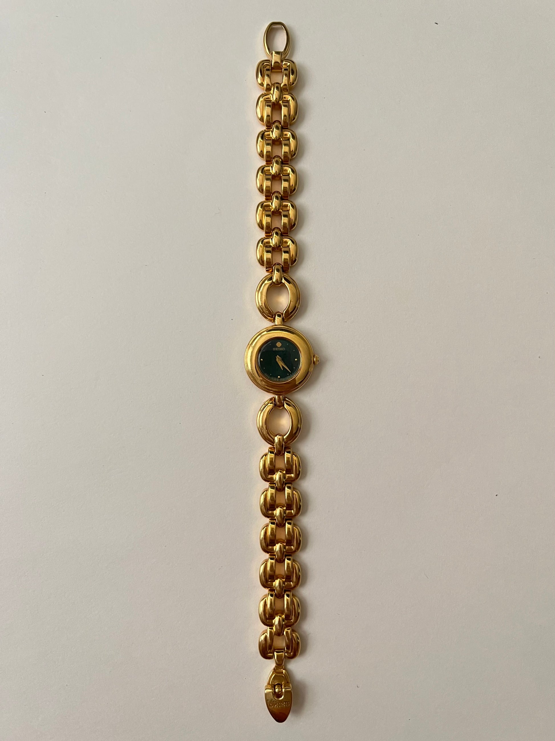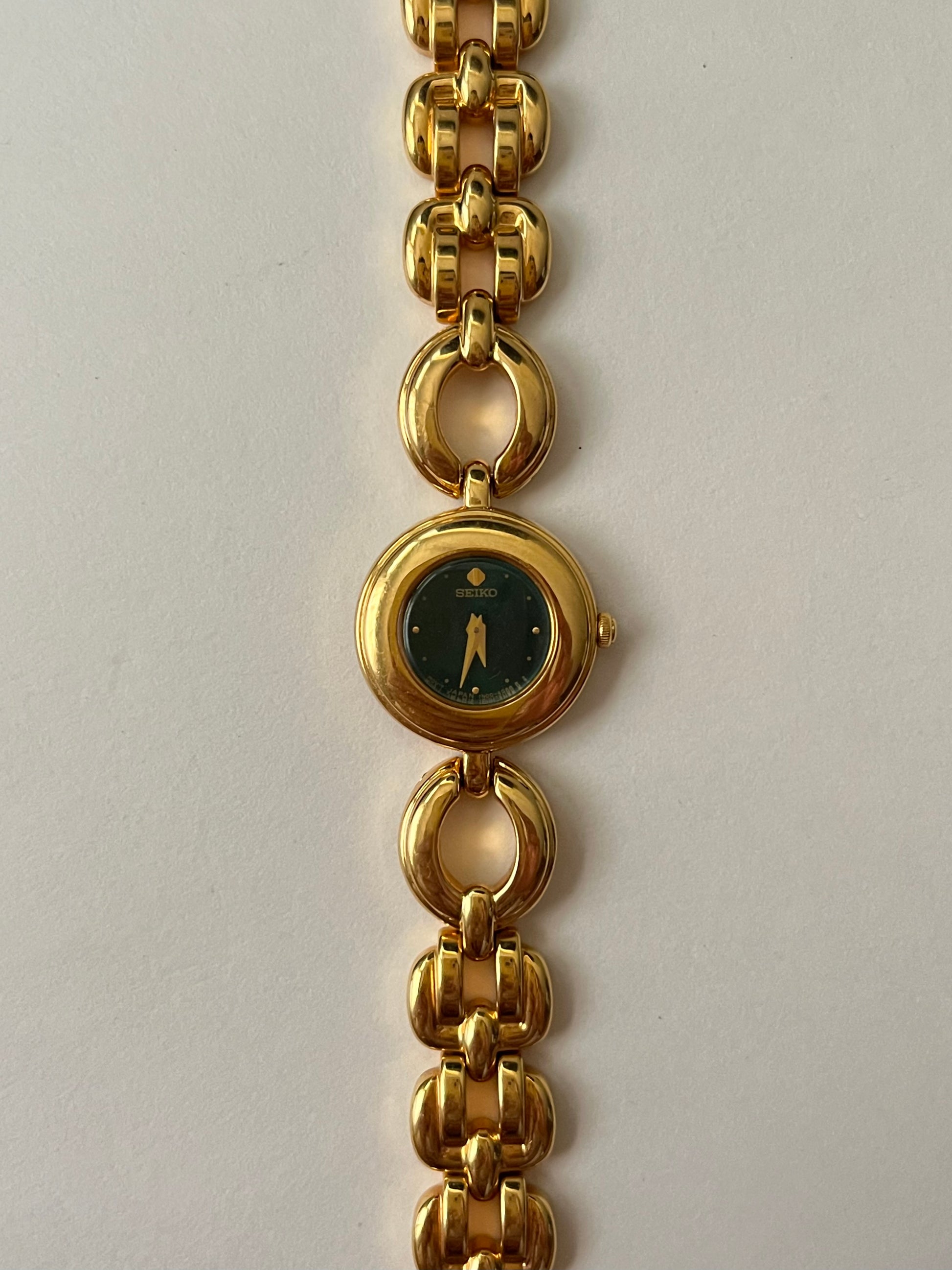 Extremely Rare and Beautiful Vintage Gold Tone Seiko Watch with Round Emerald Green Dial