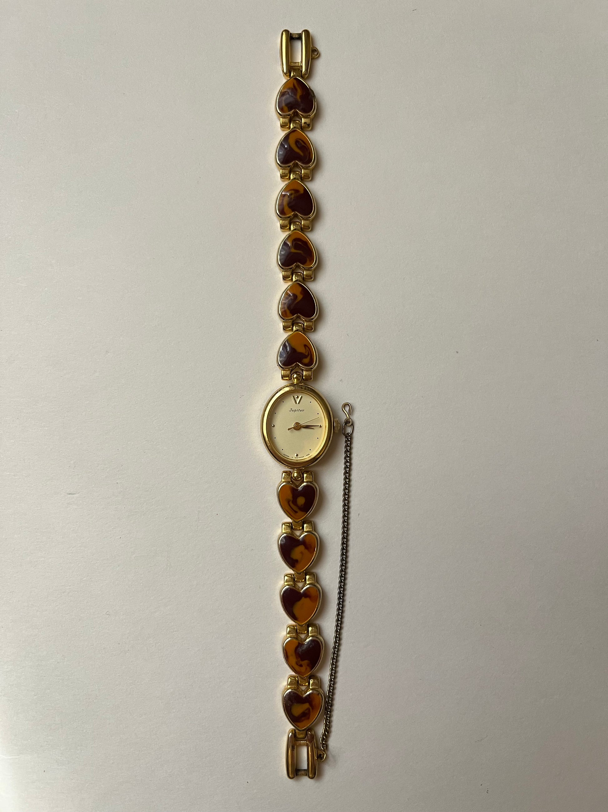 Extremely Rare Gold Tone Watch with Tortoise Shell Like Design and Heart Shaped Links