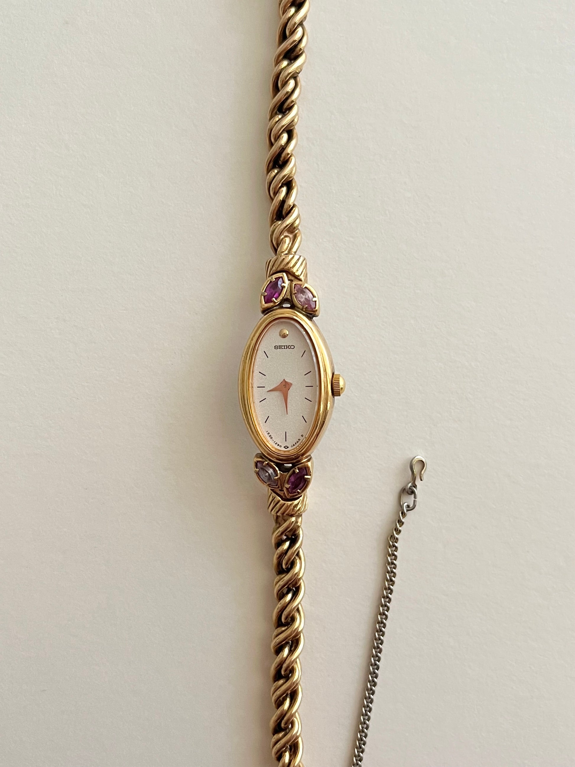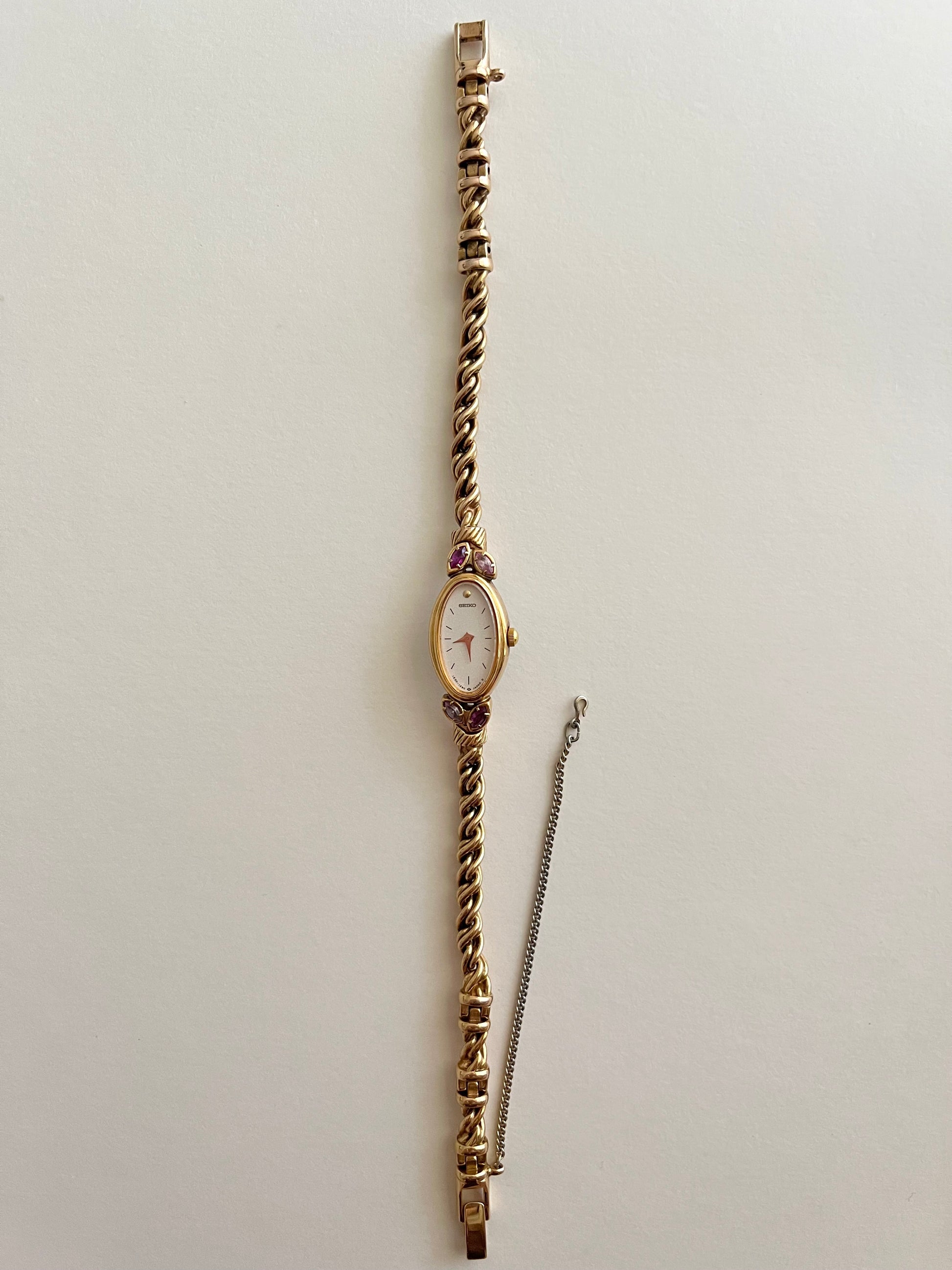 Rare Gold Tone Seiko Watch with Pink Stones and Rubies