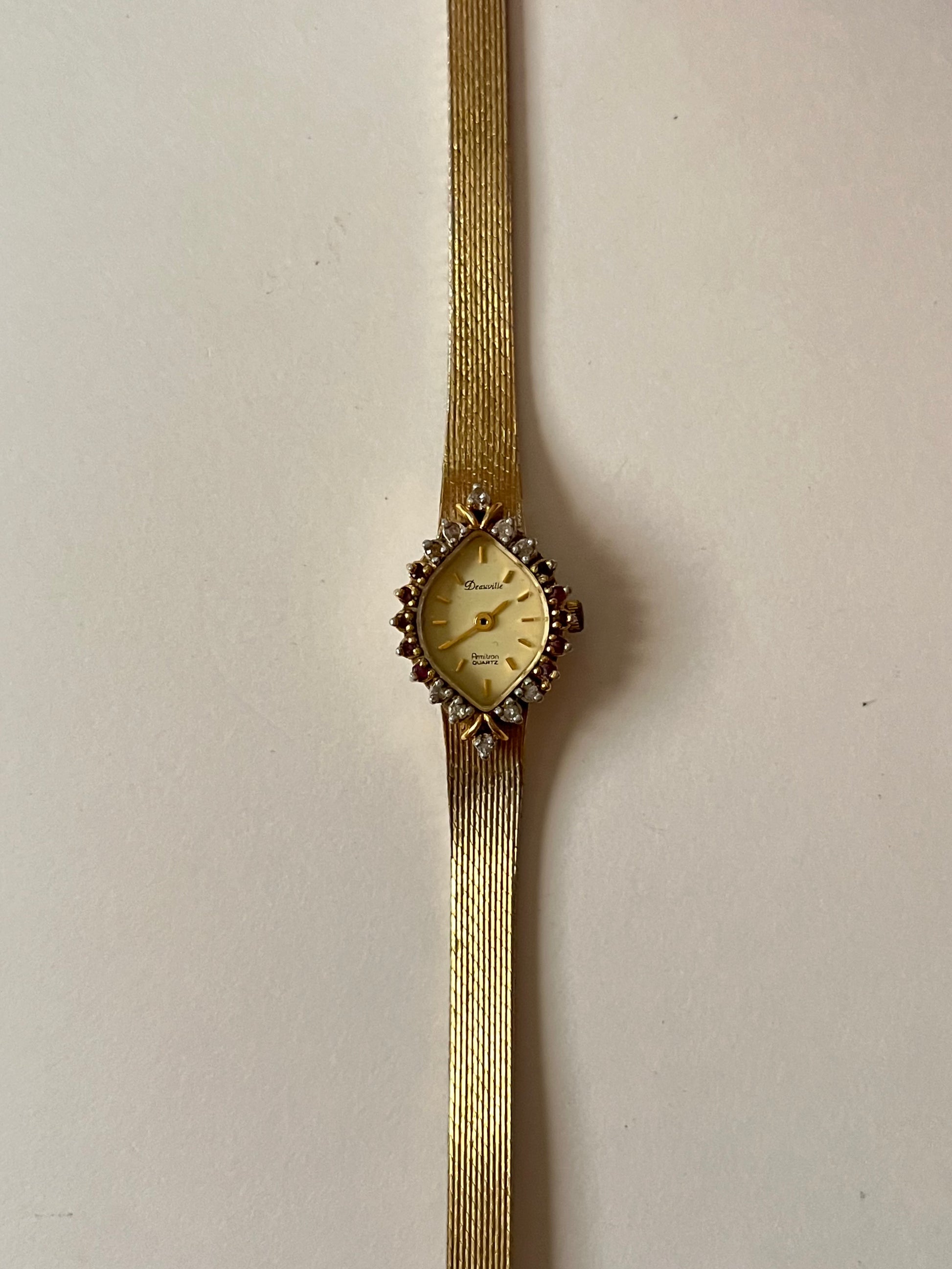 Vintage Gold Tone Watch with Diamond-Shaped Dial with Rubies Accent